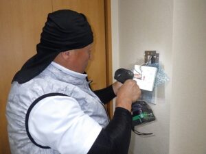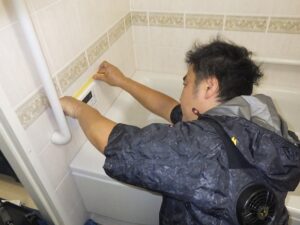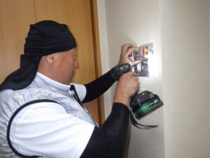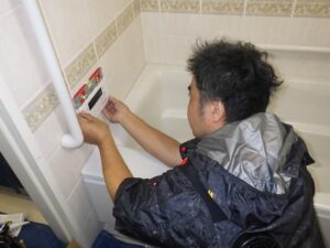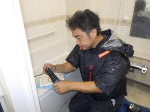 浴室リモコンの水平を確認しながら壁に取り付けます