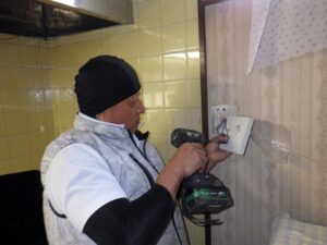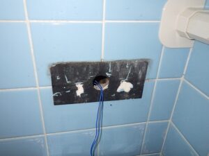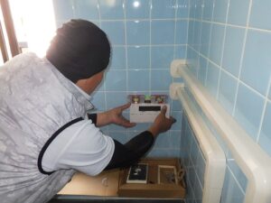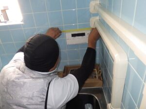 新しい浴室リモコンの水平を確認しながら壁に取り付けます