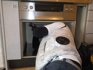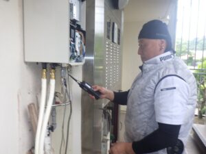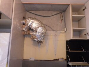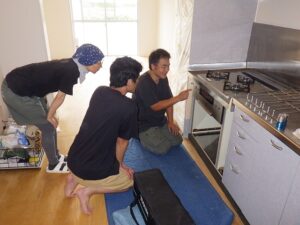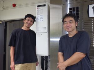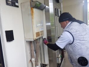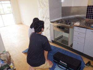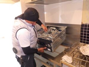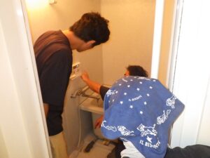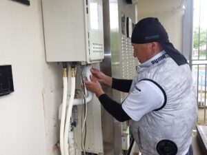お客様と一緒に水漏れ・ガス漏れを確認中です。