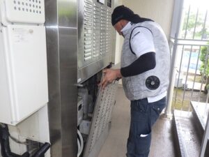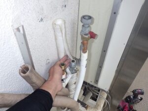 お湯、水・ガス・差し湯配管・リモコン配線、電源を取り外します