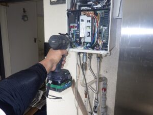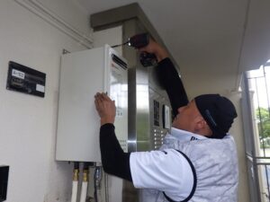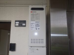 新しいノーリツスリムタイプ給湯器を壁に取り付けます