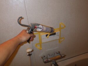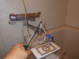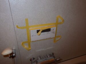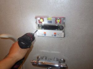 浴室リモコンの水平を確認しながら壁に取り付けます