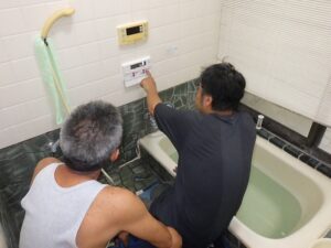 お客様に浴室リモコンの使い方の説明中です