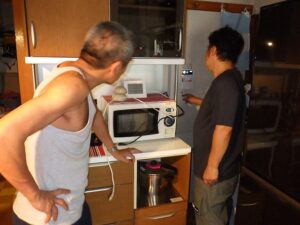 お客様に台所リモコンの使い方の説明中です