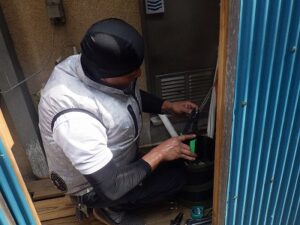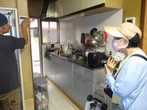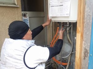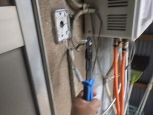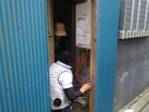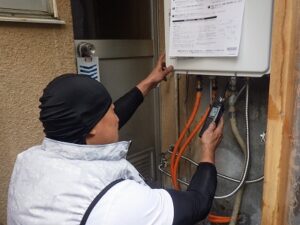 お客様と一緒に水漏れ・ガス漏れを確認中です。
