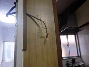 新しい台所リモコンの取り付け金具の水平を確認しながら壁に取り付けます