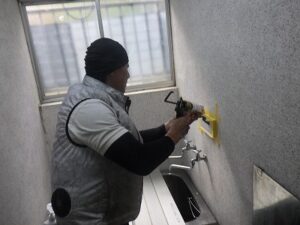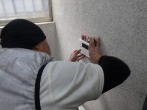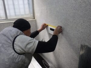 浴室リモコンの水平を確認しながら壁に取り付けます