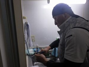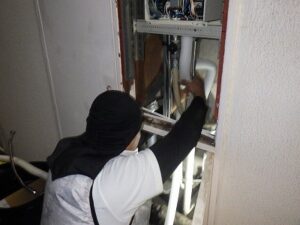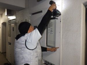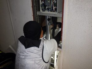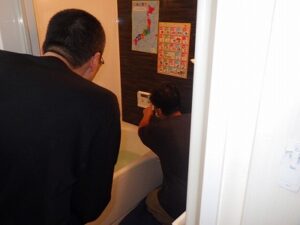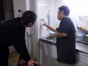 お客様と一緒に水漏れ、ガス漏れを確認中です。