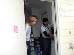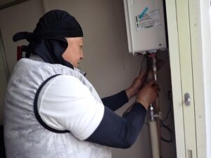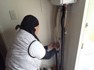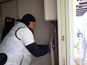 お客様と一緒に水漏れ・ガス漏れを確認中です。