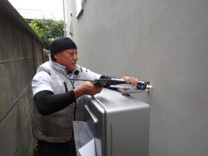 転倒防止金具を取り付けて防水のコーキングが落ちます