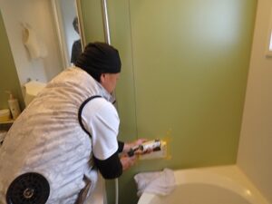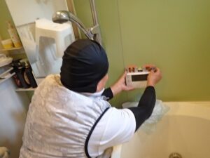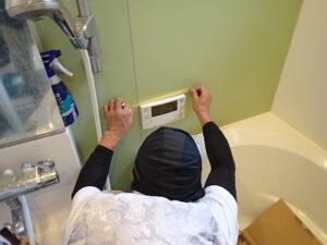 浴室リモコンの水平を確認しながら壁に取り付けます