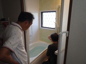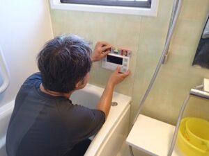 お客様に浴室リモコンの使い方の説明中です