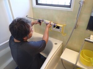 浴室リモコンの周りに防水のコーキングを打ちます