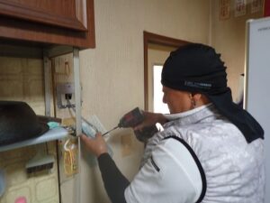 新しい台所リモコンの取り付け金具の水平を確認しながら壁に取り付けます