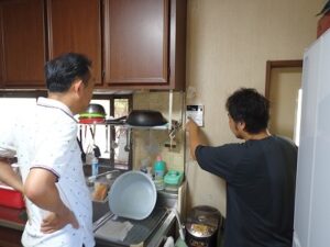 お客様と一緒に水漏れ、ガス漏れを確認中です。