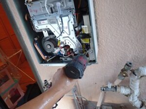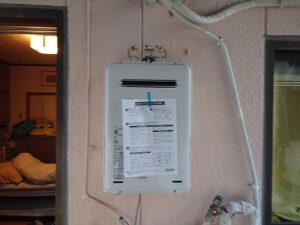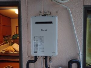 新しいリンナイ給湯専用給湯器を壁に取り付けます