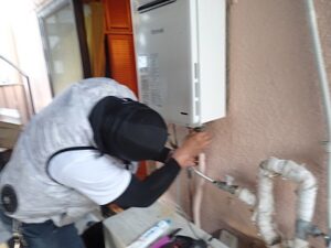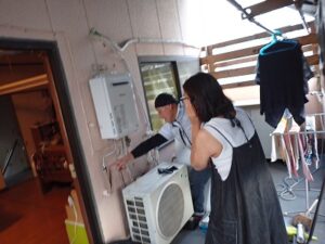 お客様と一緒に水漏れ、ガス漏れを確認中です。