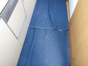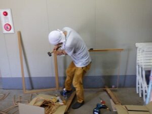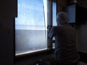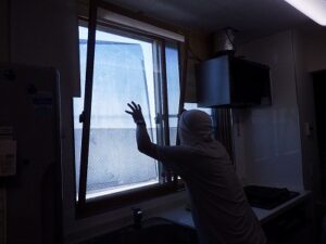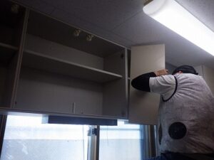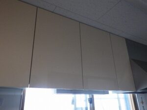 窓ガラスを外すために、こちらのキッチンの吊り戸も取り外します