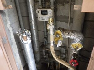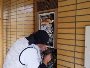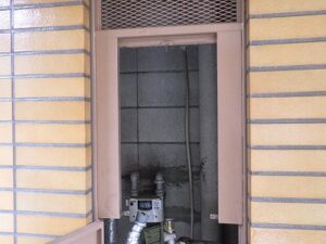 既存のノーリツ給湯器をパイプスペースより取り外します