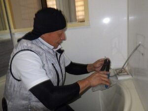 お客様と一緒に水漏れ・ガス漏れを確認中です。