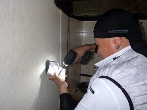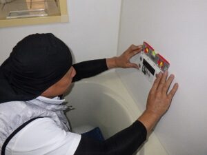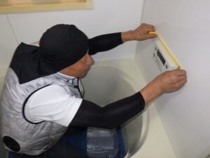 浴室リモコンの水平を確認しながら壁に取り付けます