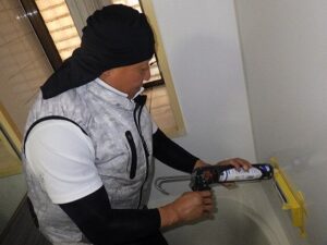 浴室リモコンの周りに防水のコーキングを打ちます