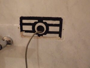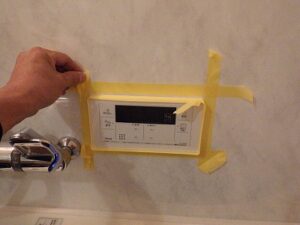 浴室リモコンの水平を確認しながら壁に取り付けます
