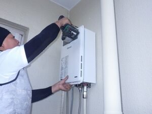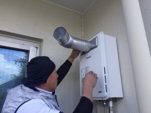 新しいリンナイ前方排気給湯専用給湯器を壁に取り付けます