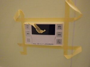 浴室リモコンの周りに防水のコーキングを打つためのマスキングテープを取り付けます