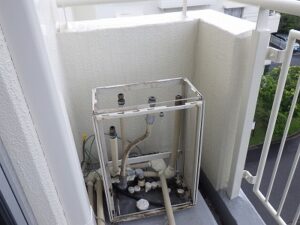 東京都多摩市豊ヶ丘ヒルサイド豊ヶ丘給湯器交換 リンナイRUF-A1610AW(A)→リンナイRUF-E161EAW・MBCTW-171・据え置き台650・側方排気部材