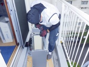 新しいリンナイエコジョーズ給湯器を据え置き台の上に設置します