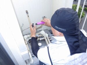 お客様と一緒に水漏れ・ガス漏れを確認中です