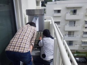 据え置き台より既存のリンナイ給湯器を取り外します