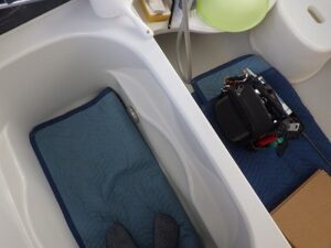 お湯、水・追い焚き配管の接続口のパッキンを取り外しておきます