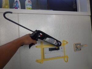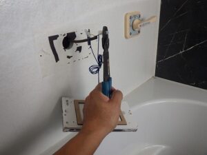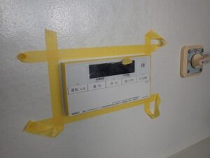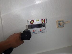 浴室リモコンの水平を確認しながら壁に取り付けます
