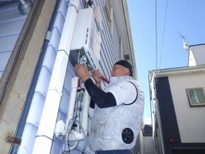 新しいリンナイ給湯専用給湯器を壁に取り付けます