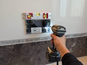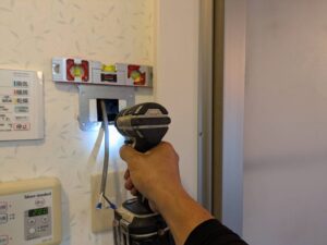 新しい台所リモコンの取り付け金具の水平を確認しながら壁に固定します