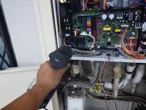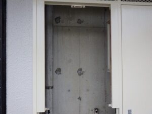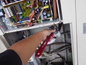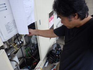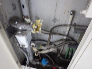 既存のリンナイTES・熱源付給湯器をパイプスペースより取り外します
