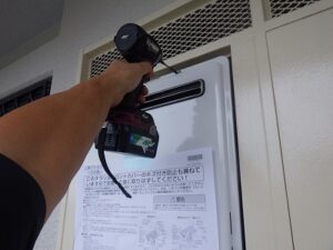 新しいリンナイTES・熱源付給湯器をパイプスペースに取り付けます