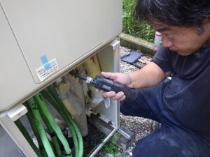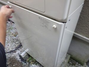 据え置き台より既存のガスター・東京ガスTES熱源付エコジョーズ給湯器を取り外します