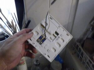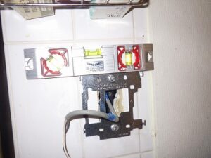 新しい台所リモコンの取り付け金具の水平を確認しながら壁に取り付けます