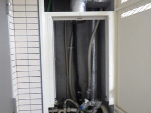 新しいリンナイTES・熱源付給湯器をパイプスペースに設置します