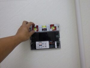 浴室リモコンの水平を確認しながら壁に取り付けます