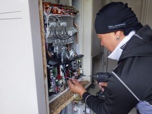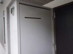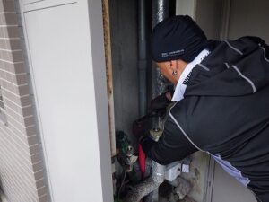 パイプスペースの扉を閉めて、ノーリツTES・熱源付き上方排気給湯器交換工事完了になります