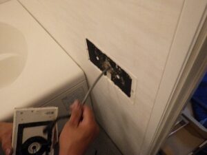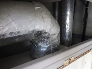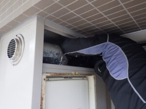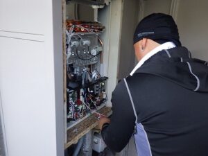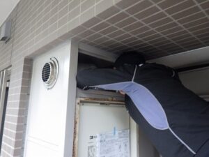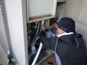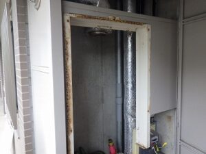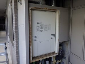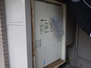 既存のノーリツTES・熱源付き上方排気給湯器をパイプスペースの枠より取り外します