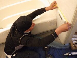 浴室リモコンの水平を確認しながら壁に取り付けます