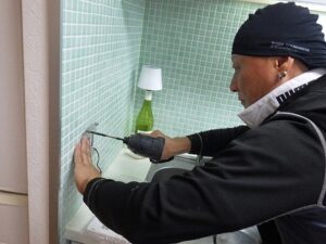 新しい台所にリモコンの取り付け金具を壁に取り付けます