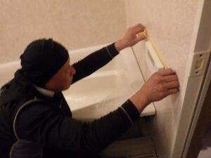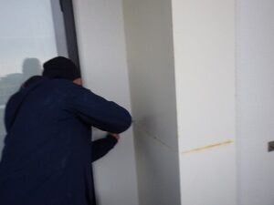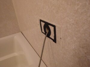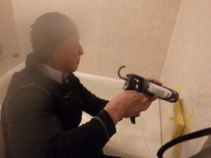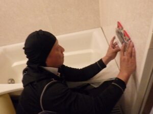 浴室リモコンの周りに防水のコーキングを打ちます