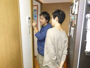 お客様に台所リモコンの使い方の説明中です