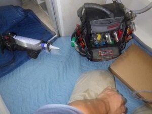お客様と一緒に水漏れ・ガス漏れを確認中です。